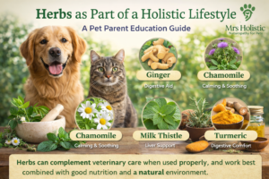 At Mrs Holistic, our goal is to educate and empower pet parents with evidence-informed, natural approaches that respect the body’s intelligence and capacity for balance. When combined with proper nutrition, a low-toxin environment, and mindful care, herbs become a powerful ally in supporting your pet’s long-term wellness.