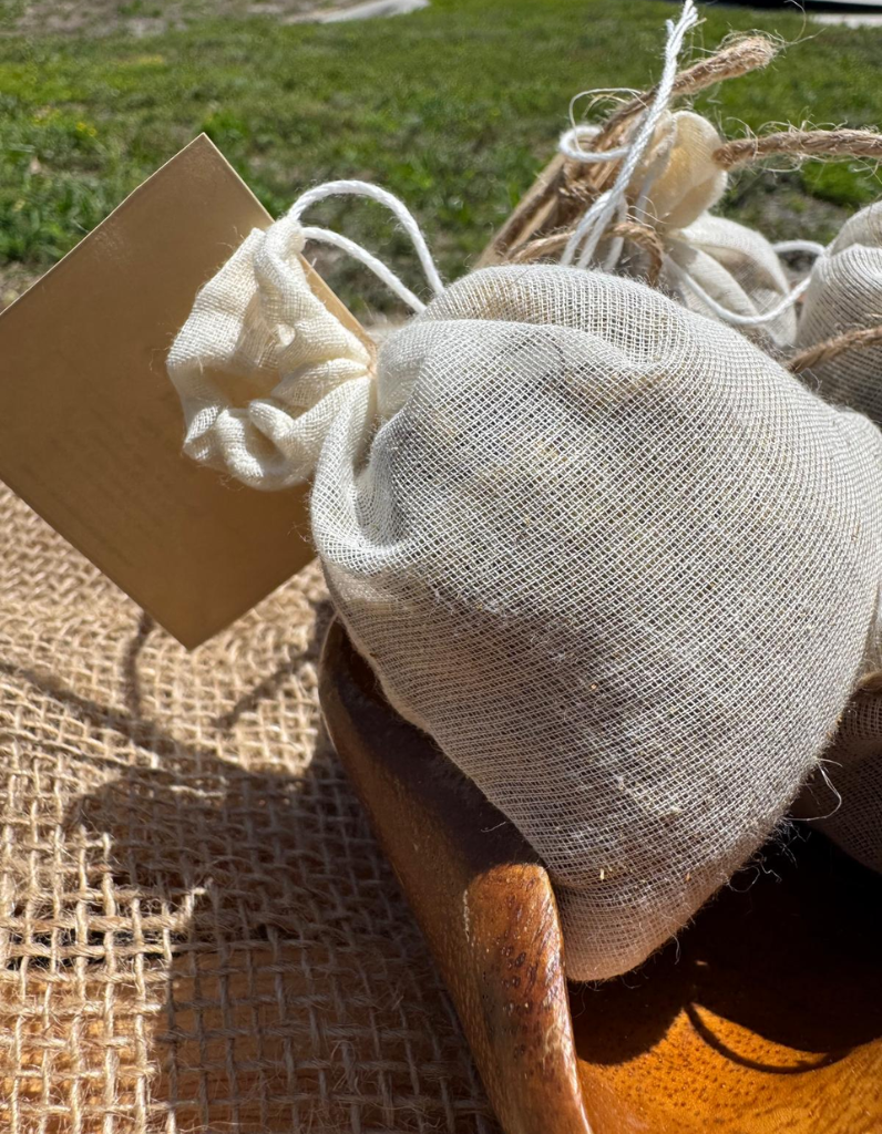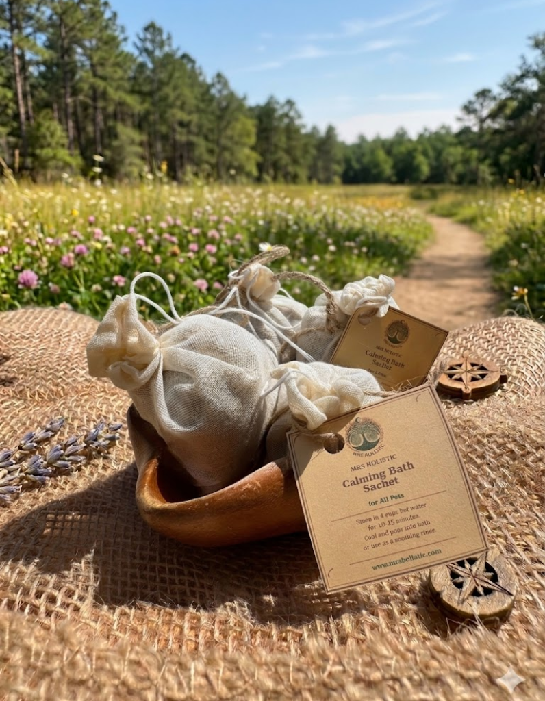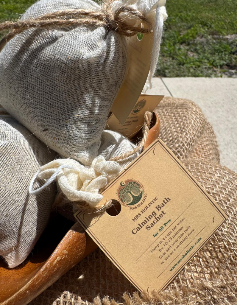 Mrs. Holistic’s Calming Herbal Bath Sachet, an all-natural treatment designed to soothe itchy skin and relax pets. To use it, you simply steep the sachet in hot water for 15 minutes, let it cool, and pour the infusion over your pet as a rinse. It is safe for most small animals and costs $7 each or two for $10.